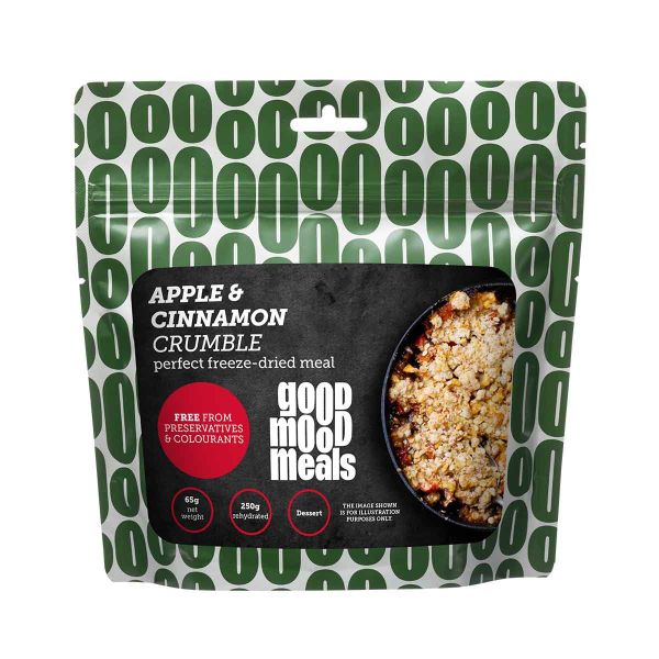Le crumble aux pommes et à la cannelle Good Mood Meals est conçu pour proposer un dessert chaud lors des activités en pleine nature. Cette recette lyophilisée associe des pommes et une préparation crumble aromatisée à la cannelle déshydratées, adaptée à une consommation en dessert ou en collation. Le produit est conditionné dans un sachet permettant une préparation directe dans l’emballage.