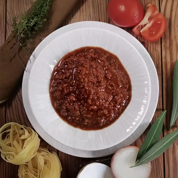 Préparée à partir de viande de bœuf hachée (25 %) et de chair à saucisse (22 %), cette sauce contient également des tomates, des oignons, des carottes, du céleri et des épices soigneusement dosées pour offrir un goût authentique et réconfortant. Elle est stérilisée en autoclave, permettant une conservation à température ambiante, sans additifs ni conservateurs.