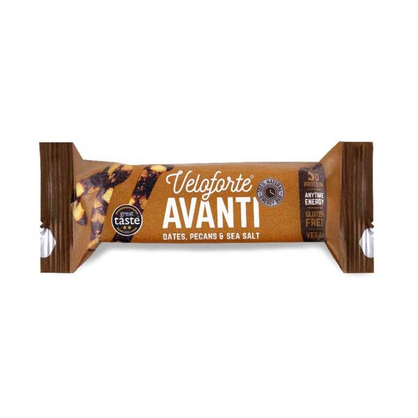 La barre Veloforte Avanti est une collation énergétique végétalienne idéale pour soutenir les efforts physiques, que ce soit avant, pendant ou après l’exercice. Elle allie performance nutritionnelle et plaisir gustatif grâce à une recette sucrée-salée équilibrée, composée de dattes juteuses, de noix de pécan croquantes, d’amandes et d’une touche de sel marin.