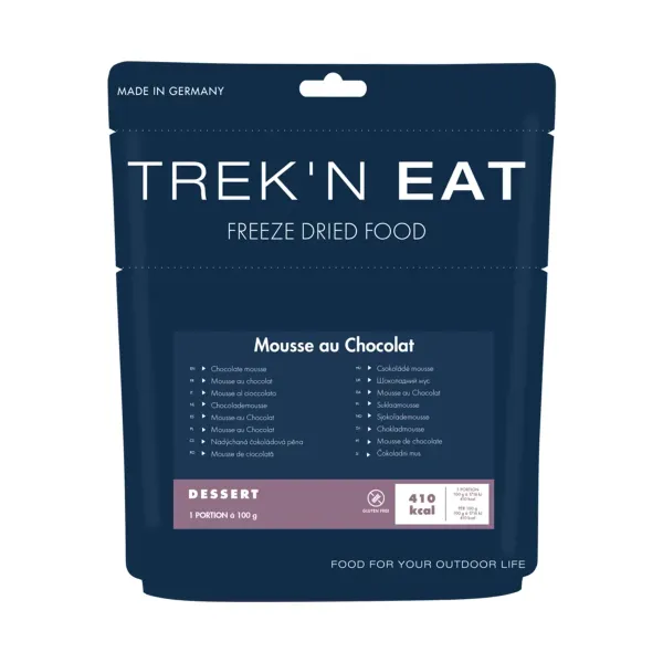 La mousse au chocolat de Trek’n Eat est un dessert onctueux et gourmand, idéal pour conclure un repas outdoor sur une note sucrée. Facile à préparer, il suffit d’ajouter 100 ml d’eau pour obtenir une mousse légère, au goût intense de chocolat, qui ravira tous les amateurs.