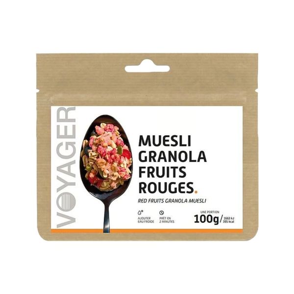 Le muesli granola aux fruits rouges de Voyager est un petit-déjeuner lyophilisé de 100 g seulement. A transporter partout où que vous soyez que ce soit pendant votre expédition, en trekking ou même pendant votre randonnée. Vos enfants vont aussi l'adorer.