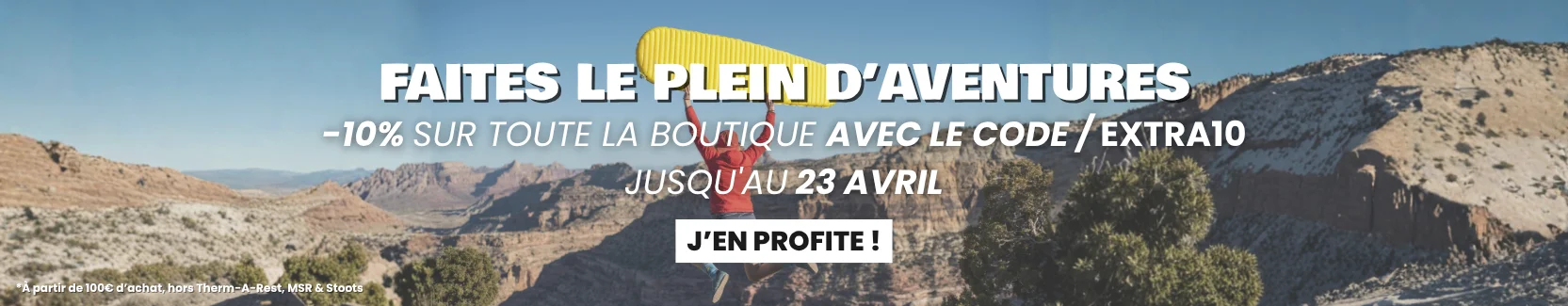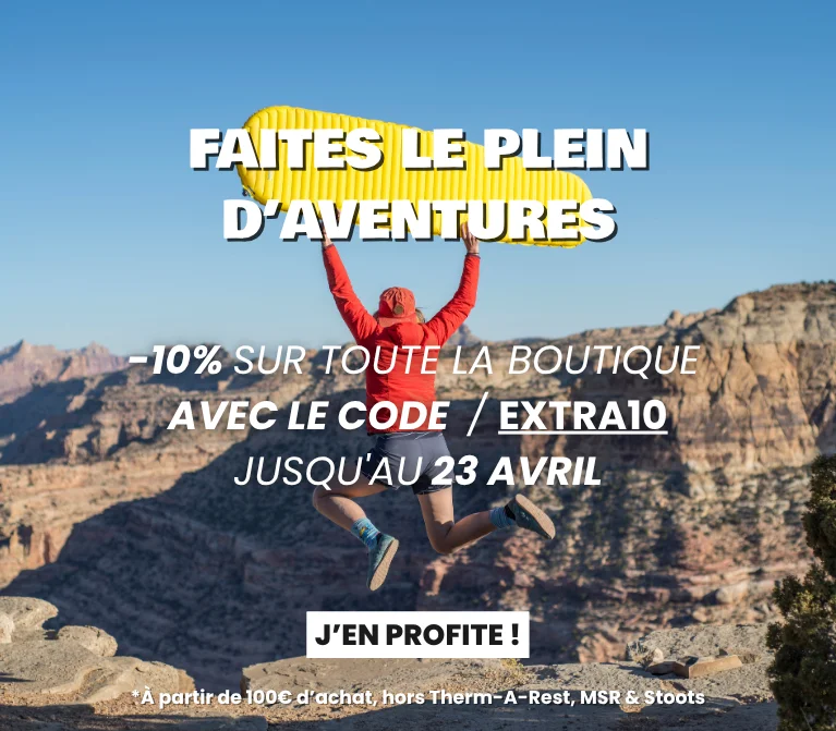 -10% sur votre commande avec le code EXTRA10 jusqu'au 23 avril (À partir de 100€ d'achat, hors MSR, Thermarest & Stoots)