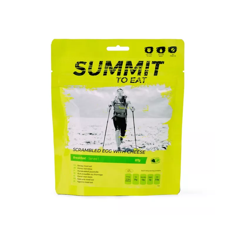 Ce sachet d'oeufs brouillés au fromage est un petit-déjeuner lyophilisé salé à apprécier lors de vos sorties en trek, en bivouac. C'est seulement 87 g qui vous apportera environ 454 Kcal. Il a été préparé par Summit to Eat, marque anglaise, concevant des produits alimentaires lyophilisés de qualité.