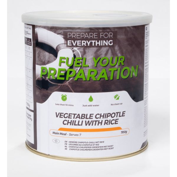 Le Chili Chipotle accompagné de légumes et riz conditionné en boite contient 700 g de cette recette de lyophilisé, soit 7 portions. De plus ce Chili végétarien est conditionné dans une boite permettant de le conserver 25 ans après date de fabrication.