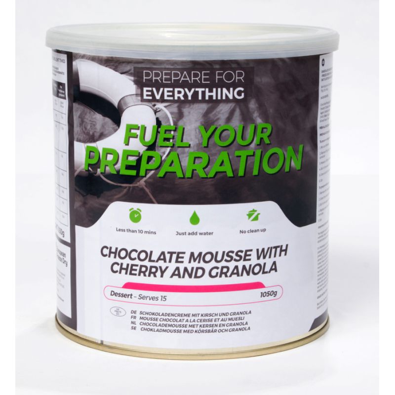 Ce sont 15 portions de Mousse au Chocolat, Granola accompagné de Cerises qui sont conditionnées dans une boite permettant de conserver ce dessert pendant 25 ans après date de fabrication. C'est un produit lyophilisé idéal à stocker en cas de situation d'urgence pour se partager un dessert au chocolat en famille.