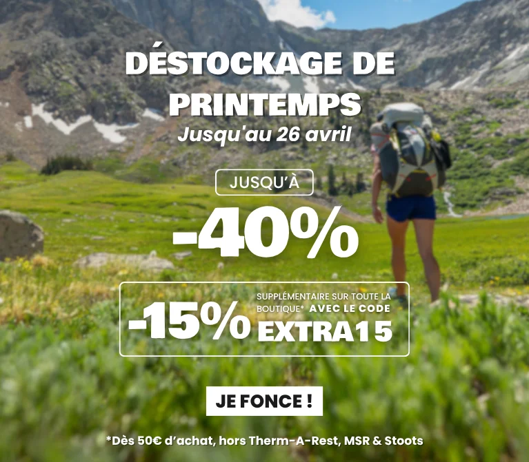 -15% sur votre commande avec le code EXTRA15 jusqu'au 23 avril (À partir de 50€ d'achat, hors MSR, Thermarest & Stoots)