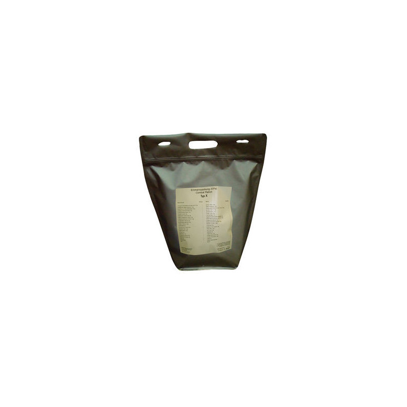 Conditionnée dans un sachet souple avec une anse de transport, elle se glisse facilement dans un sac à dos. Son zip refermable permet d’accéder au contenu à tout moment tout en assurant une bonne conservation. L’ensemble de la ration nécessite environ 5,6 litres d’eau pour être réhydraté.