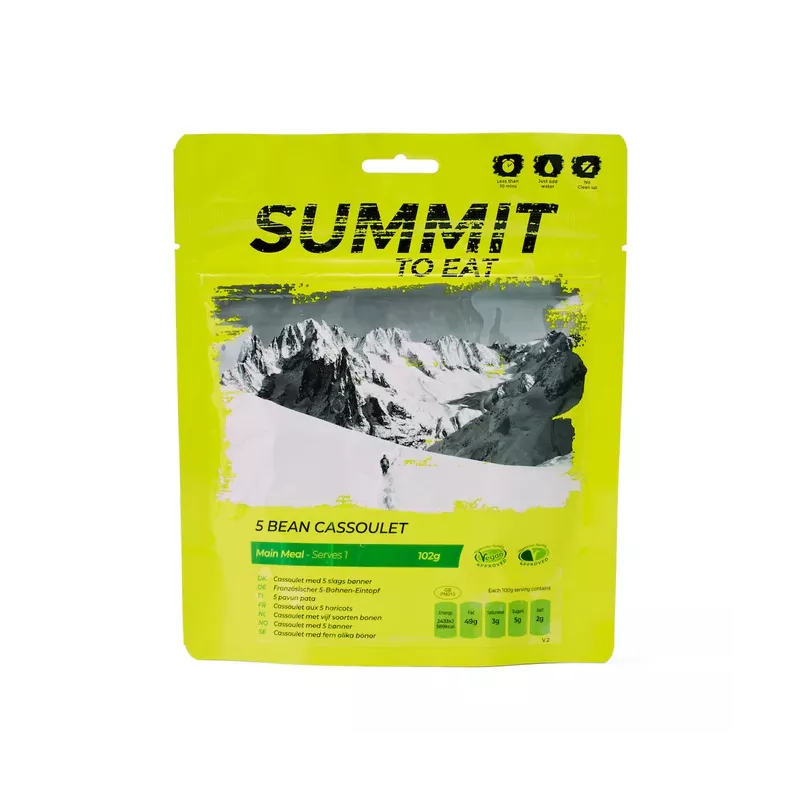 Ce cassoulet aux 5 haricots et aux légumes accompagné d'une sauce à l'ail aux herbes est un plat vegan lyophilisé préparé avec des ingrédients 100% naturels par la marque anglaise Summit to Eat. C'est un repas de 600 Kcal, riche en lipides, ce qui en fait l'un des plats les plus caloriques au 100 g de cette marque.