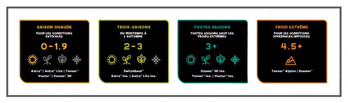 Le choix de la R-Value dépend directement de la période et des conditions dans lesquelles vous pratiquez vos activités outdoor.